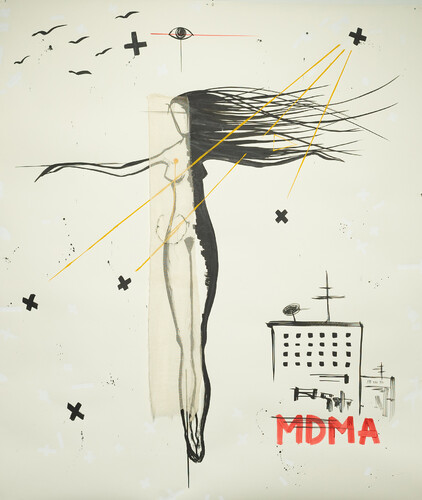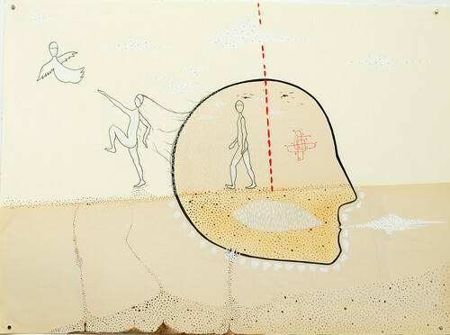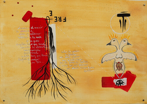 En la obra combina tierras, pigmentos naturales al agua, fragmentos de papel de oficina, rotulador y aerógrafo, intercalando lo natural con técnicas industriales para enfatizar –con su materialidad– las formas de vida que transitamos. El artista construye una cosmogonía en la que hayamos elementos como el fuego y la tierra; estados de la materia como lo líquido y lo gaseoso